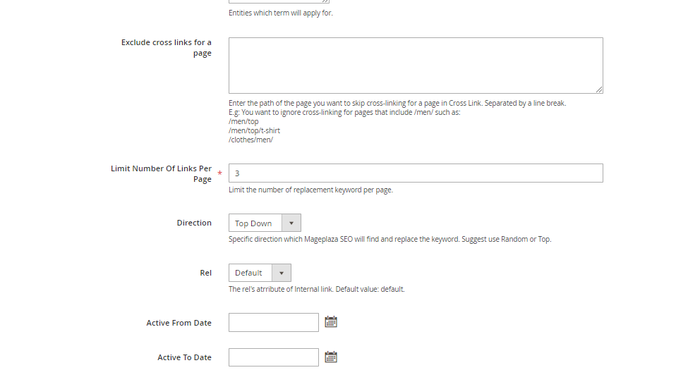 Exclude cross links for a page: Exclude the application of cross links on some pages. Multiple pages can be entered and separated by line breaks