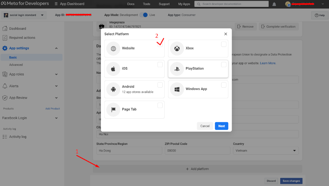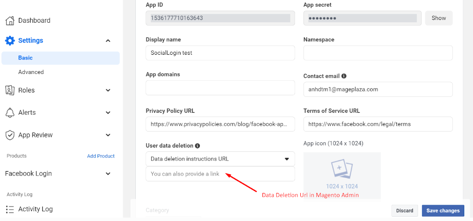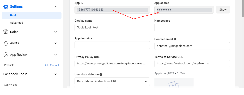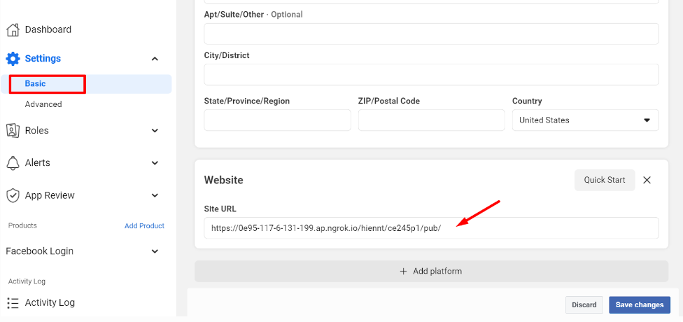 Next, at page Basic, enter the url in App Domains, Site URL and URL Privacy Policy fields. They should match with the current hostname example.com.