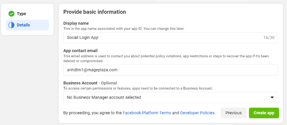 Then, redirect to the app creation page. Fill out Display name, Email for your app.