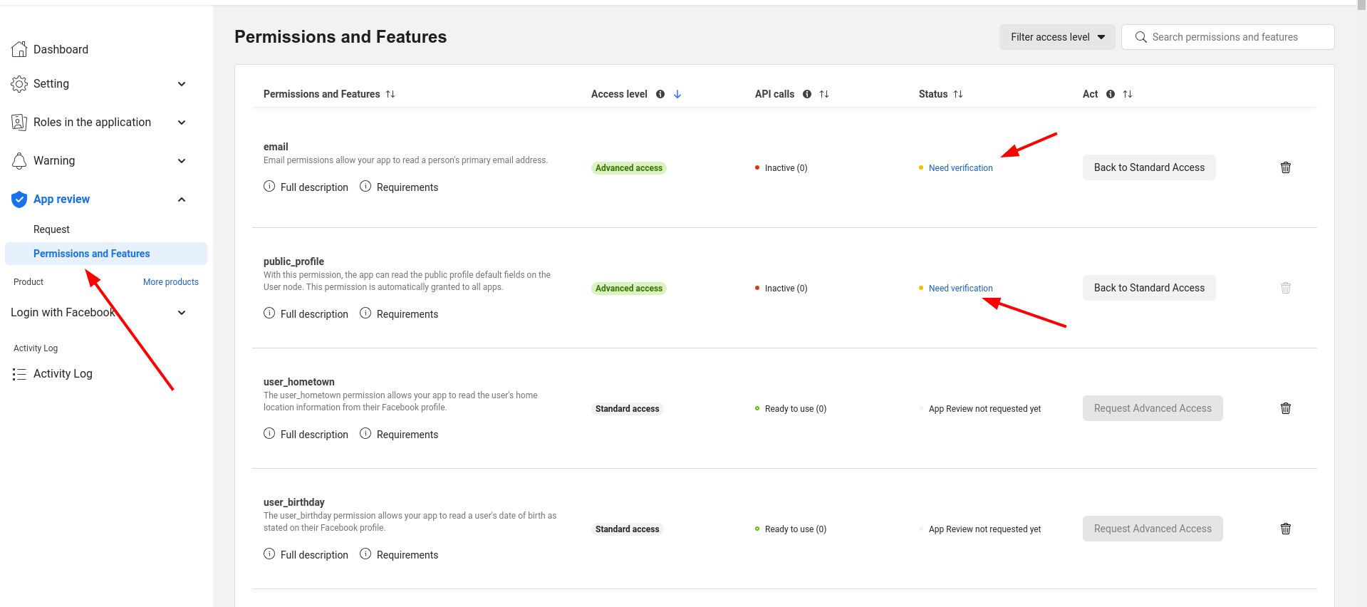 Add Permissions & Verification by going to App Review and select Permissions and Features: