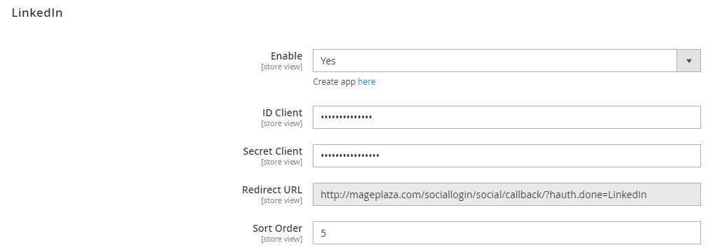 Go to Store > Settings > Configuration > Mageplaza Extensions > Social Login > Linkedln