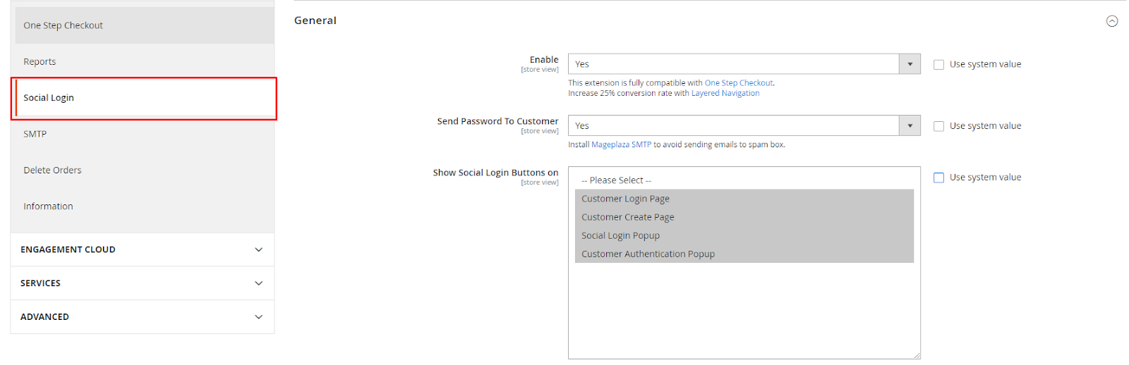 From Magento Admin, select Store > Settings > Configuration > Mageplaza Extensions > Social Login.