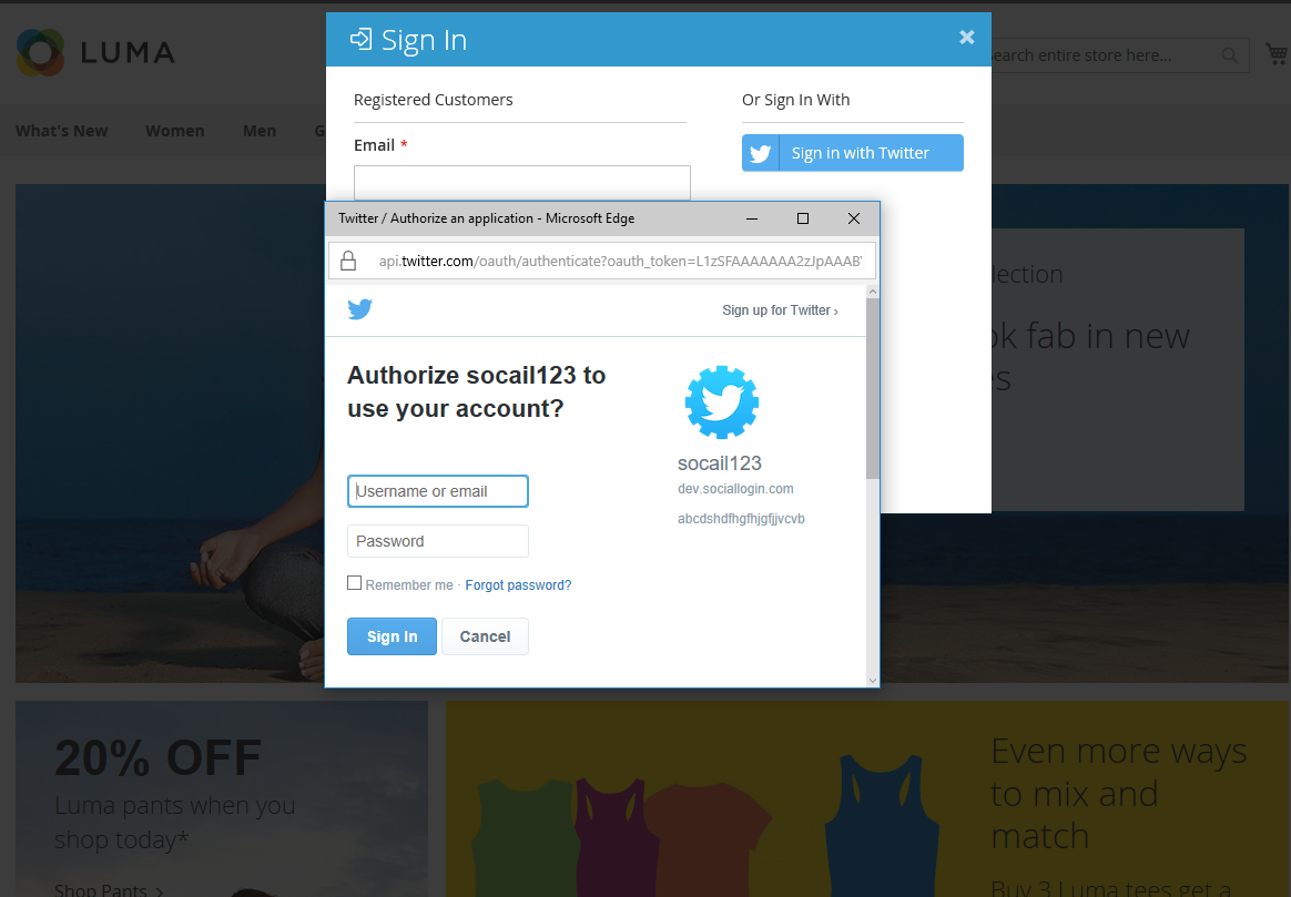 Twitter Login dialog will be shown after clicking on Sign in with Twitter button.