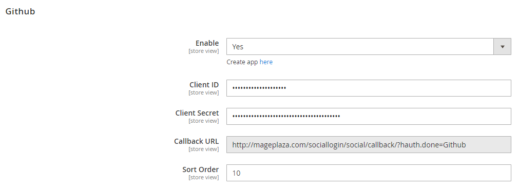 Go to Store > Settings > Configuration > Mageplaza Extensions > Social Login > Github.