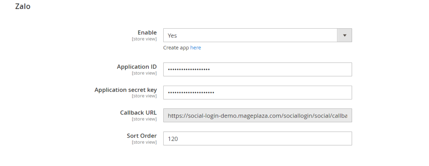 Go to Store > Settings > Configuration > Mageplaza Extensions > Social Login > Zalo.
