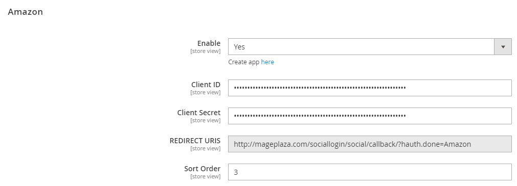 Go to Store > Settings > Configuration > Mageplaza Extensions > Social Login > Amazon.
