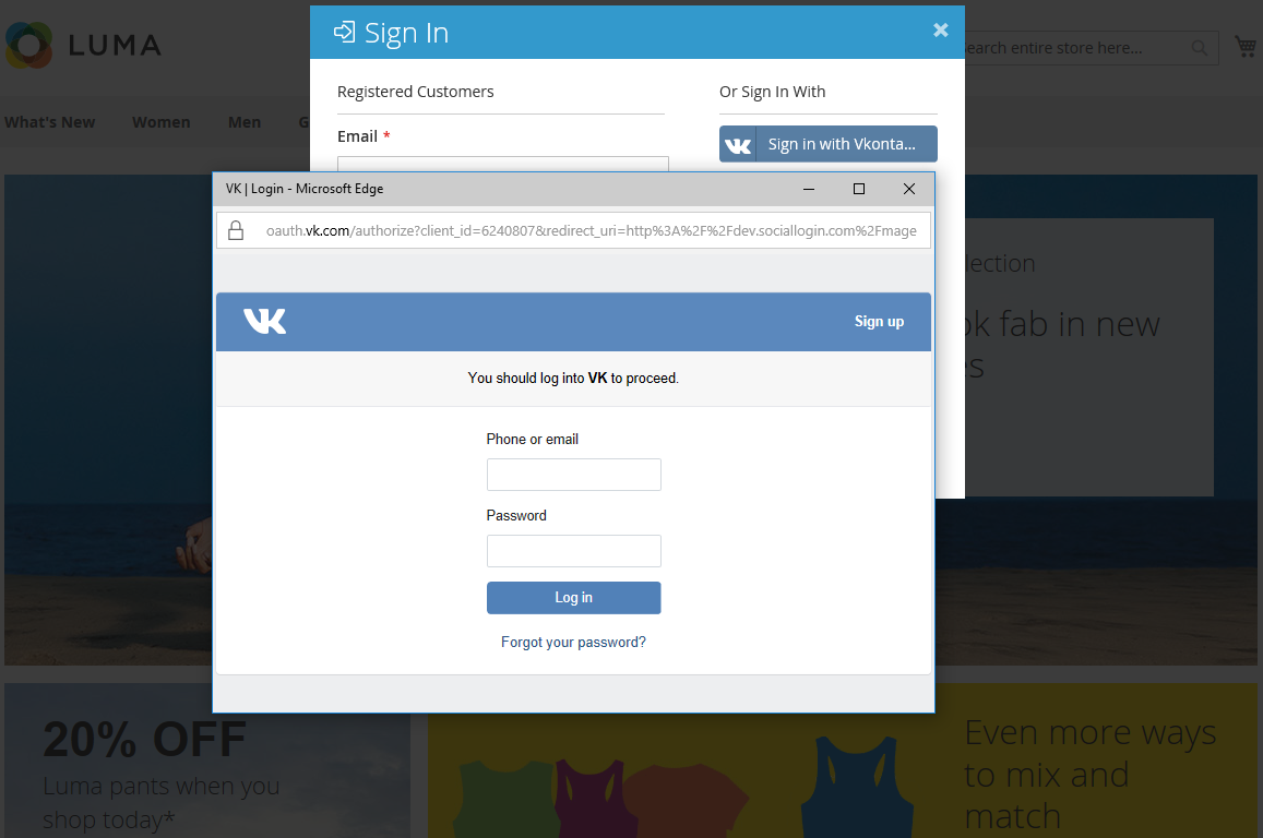 Vkontakte Login dialog will be shown after clicking on Sign in with Vkontakte button.