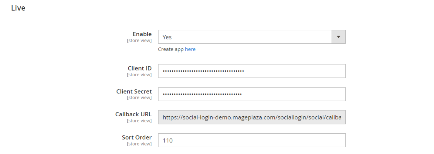 Go to Store > Settings > Configuration > Mageplaza Extensions > Social Login > Live.
