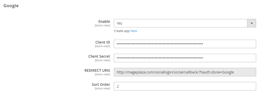 Go to Store > Settings > Configuration > Mageplaza Extensions > Social Login > Google.
