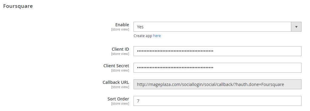 Go to Store > Settings > Configuration > Mageplaza Extensions > Social Login > Foursquare.