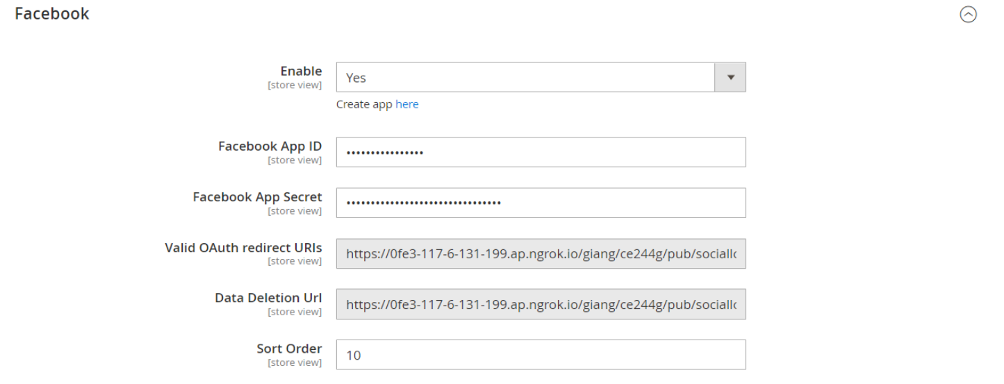 Go to Store > Settings > Configuration > Mageplaza Extensions > Social Login > Facebook.