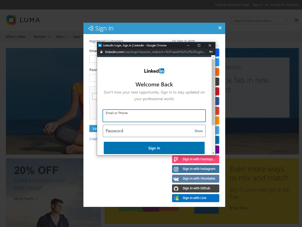 LinkedIn Login dialog will be shown after clicking on Sign in with LinkedIn button.