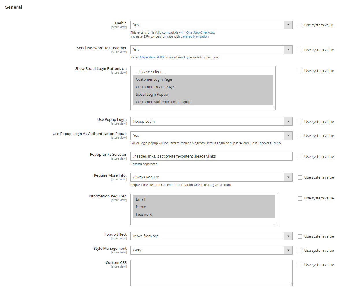 - Information Required: Admin can choose to ask additional information of customers after they create social account. The information can be Name, Email, Password. This is a required field and you can choose mutiple iptions here.