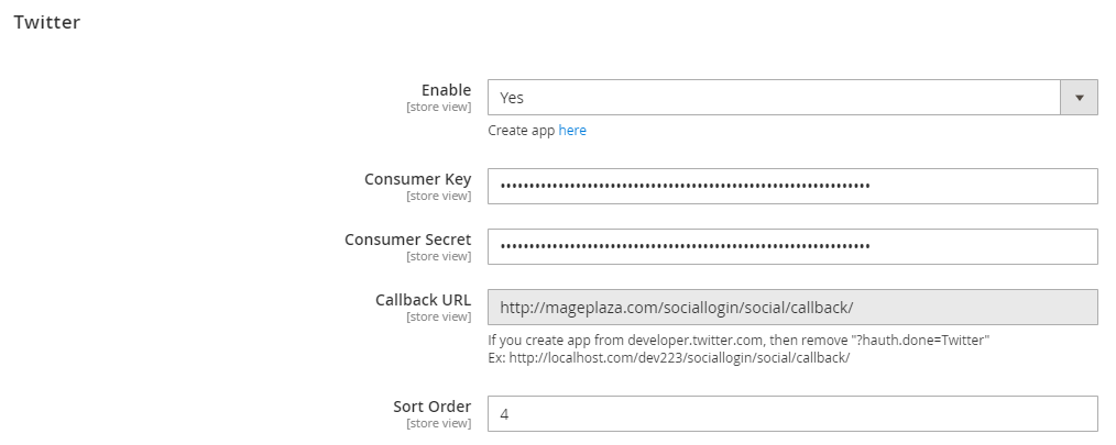 Go to Store > Settings > Configuration > Mageplaza Extensions > Social Login > Twitter.