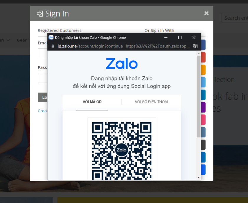 Zalo Login dialog will be shown after clicking on Sign in with Zalo button or scanning the QR code.