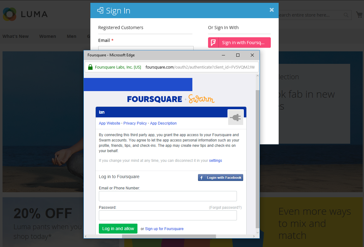 Foursquare Login dialog will be shown after clicking on Sign in with Foursquare button.
