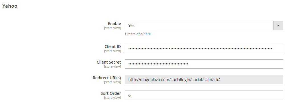 Go to Store > Settings > Configuration > Mageplaza Extensions > Social Login > Yahoo.