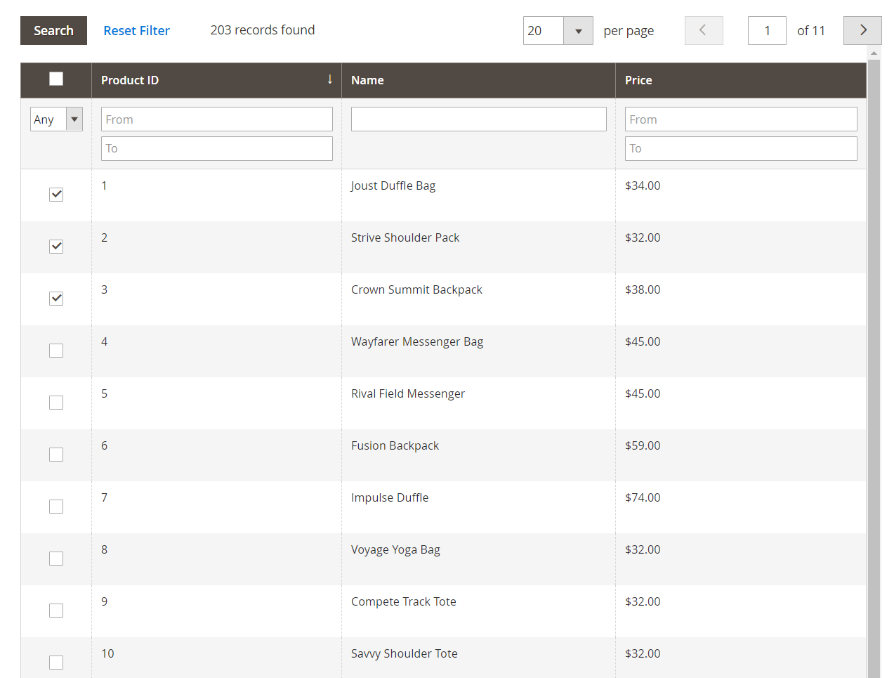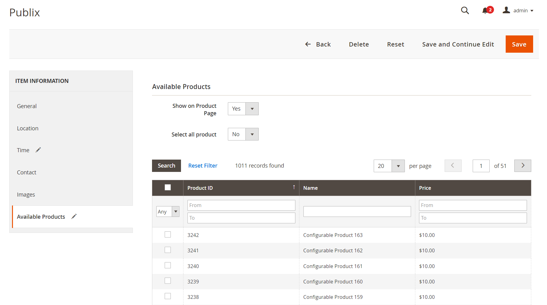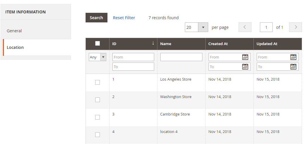 - Selected Product: This part records the information of products within related stores. Admins can search, filter product ID, SKU, Price in the Grid. Admin can add products to each store locator.