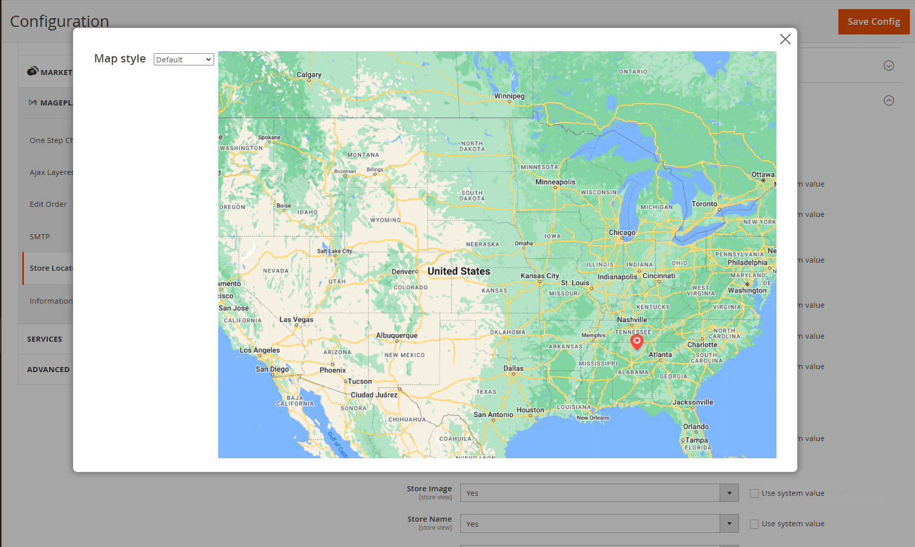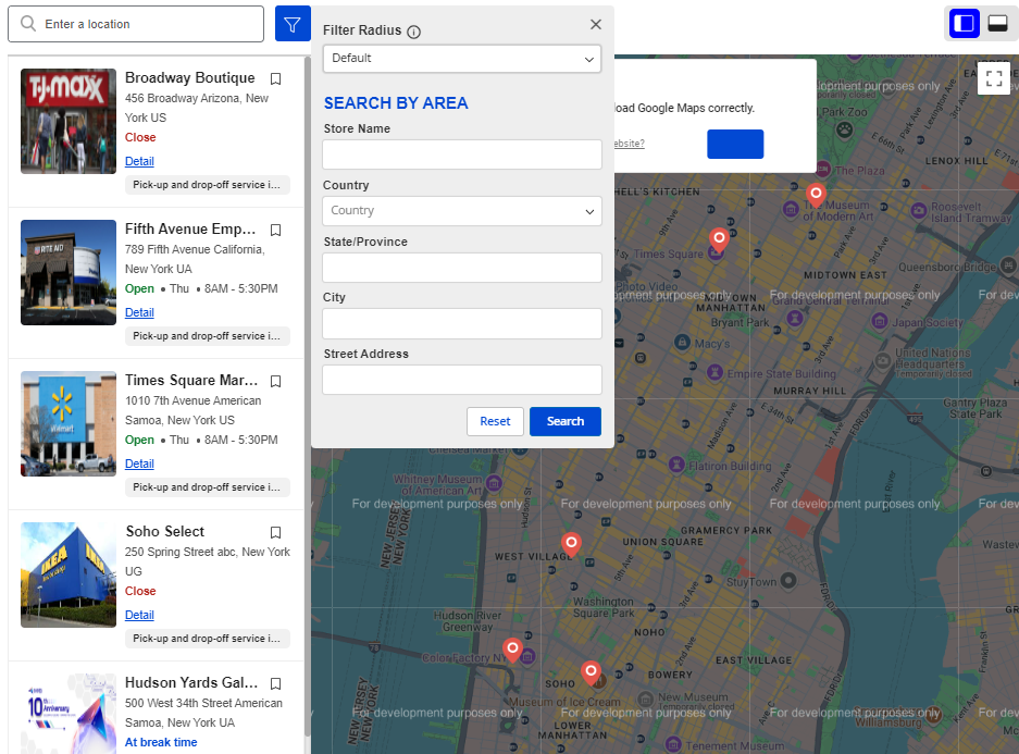 Enable Search By Area: If Yes, the Search By Area feature will be displayed in the store information map, enabling customers to search for stores more quickly based on where customers are, including fields such as Store Name, Street Address, Country, City, Zip/Postal Code, State/ Province. Click the Reset button to reset and display all stores.