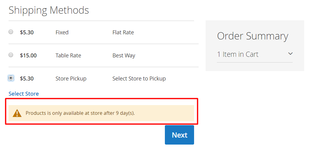 Show Methods if Not Applicable: If Yes, the store pickup method will still be displayed even when not applicable to some addresses or countries that customers selected, and the Displayed Error Message will be shown.