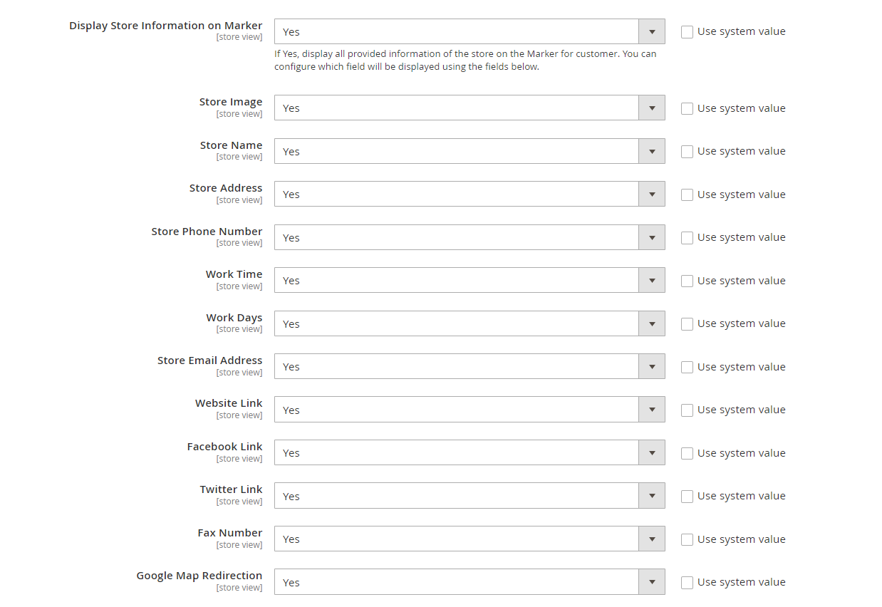 Display Store Information on Marker: If Yes, it will display all store information provided on the Marker to customers. You can configure which fields will be displayed using the fields below which are dependent on this field.