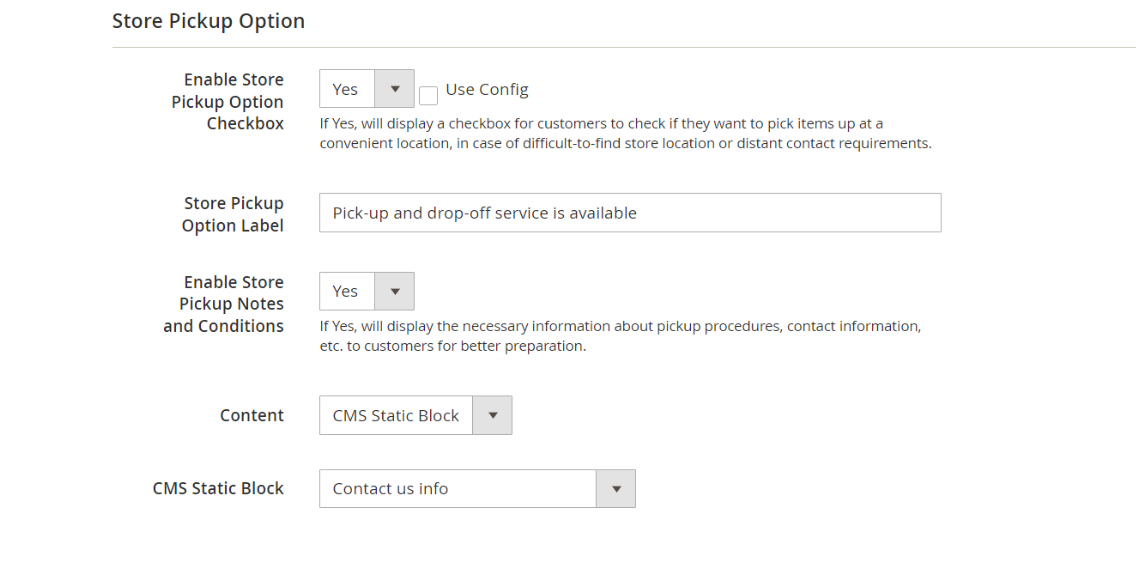 - Enable Store Pickup Notes and Conditions: If Yes, will display the necessary information about pickup procedures, contact information, etc. to customers for better preparation.