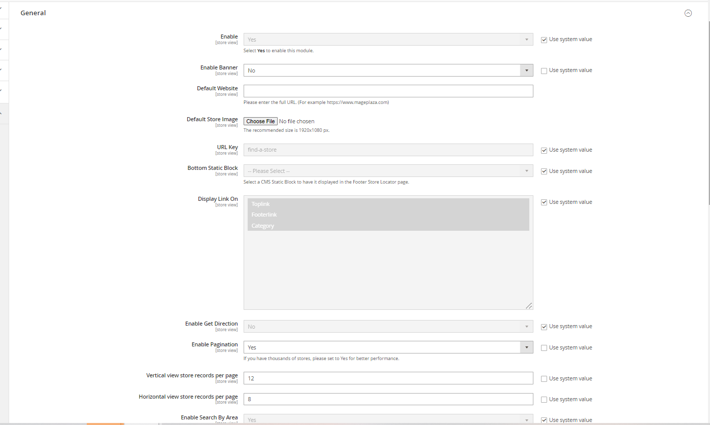 Bottom Static Block: Select a CMS Static Block to have it displayed on the Footer Store Locator pageDisplay Link On: Select where the link can be displayed on the frontendEnable Get Direction: Select Yes to enable the directions to the store when customers wantEnable Pagination: If Yes, pagination will be displayed when you have multiple stores. It will improve customer experience significantly. You can set the number of stores per page for both vertical and horizontal layouts with two fields:- Vertical view store records per page: For the optimal user interface, the admin can only set the field's value greater than or equal to 6, and only positive integers are allowed. We highly recommend setting it to 10.
