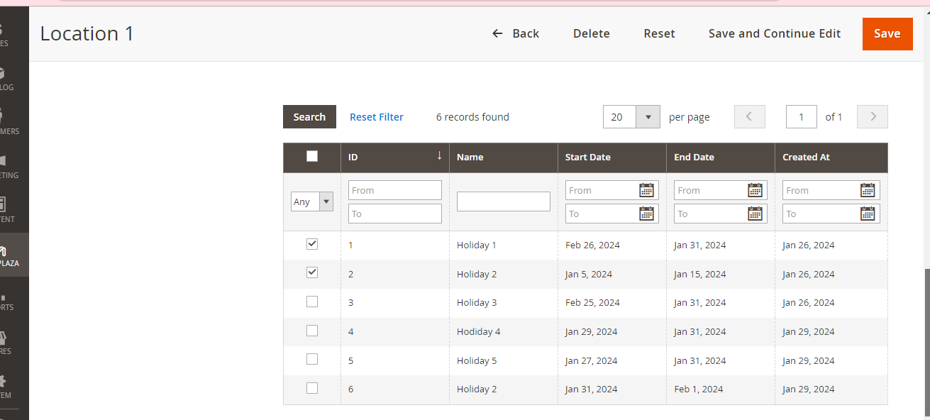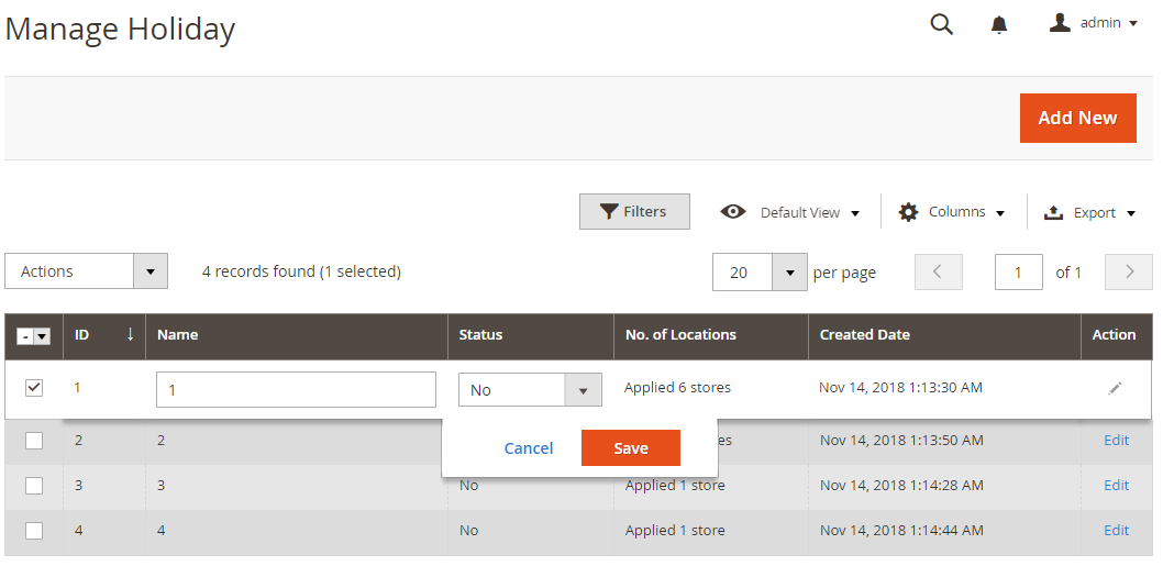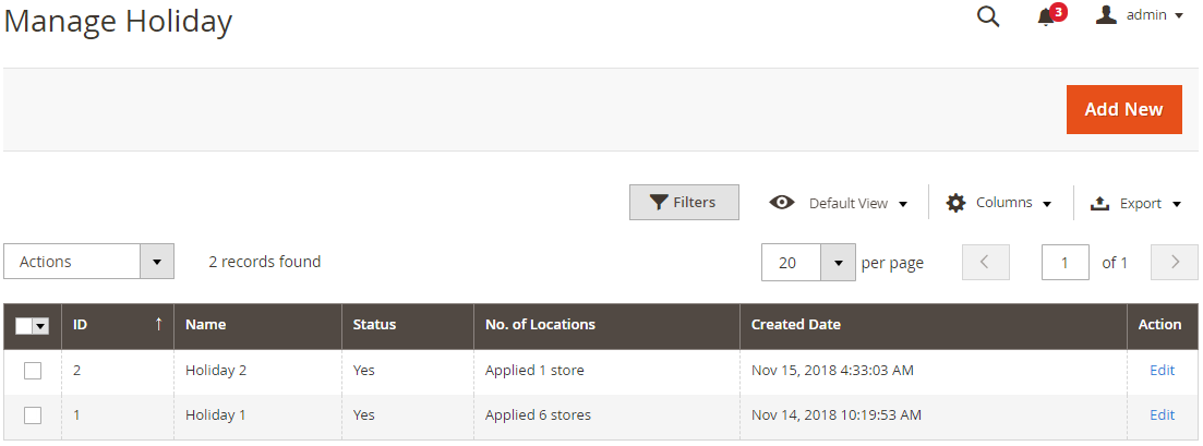 Actioncolumn, Admin can click Edit to modify Holiday informationIn addition, admins can Filter, Change Store View, hide/show Columns, Export Grid or edit inline