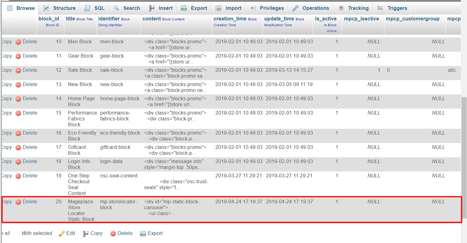 Next, go to mp_cms_block then delete mp-storelocator-block