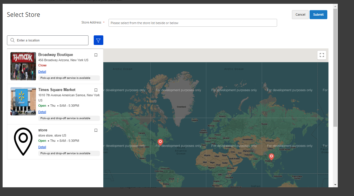 - Note: Only show the opening time of stores. The time waiting for an order is available or the closing time of the store will be hidden, so customers cannot choose them. Then click Submit button to confirm the store location and time to pickup items. Click Cancel to quit the popup.