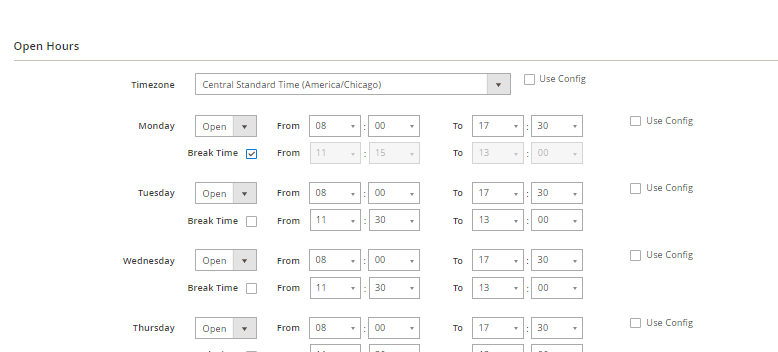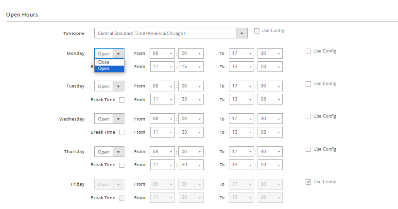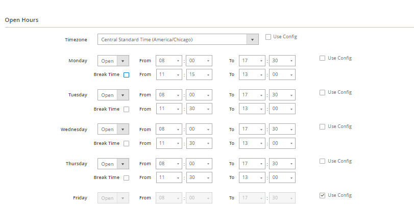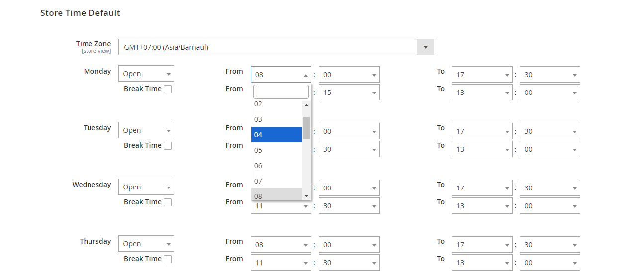 - Admins can set the timezone and opening time for each item of the week for all stores. These values are only default values. They are only applied when admins click the