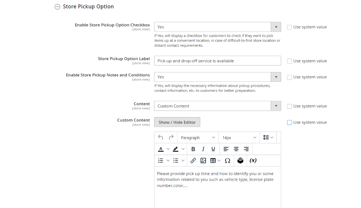 - Custom Content: Show the Custom Content field for the store owner to edit the content in the Store Pickup Notes and Conditions section.