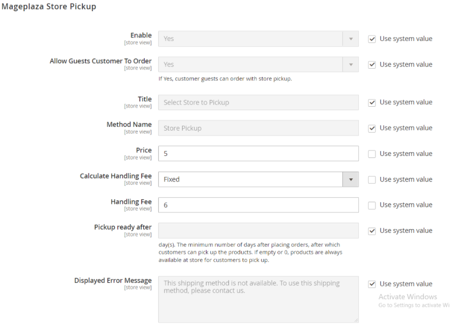 Login to the Magento Admin, choose Stores > Configuration > Sales > Shipping Methods > Mageplaza Store Pickup.