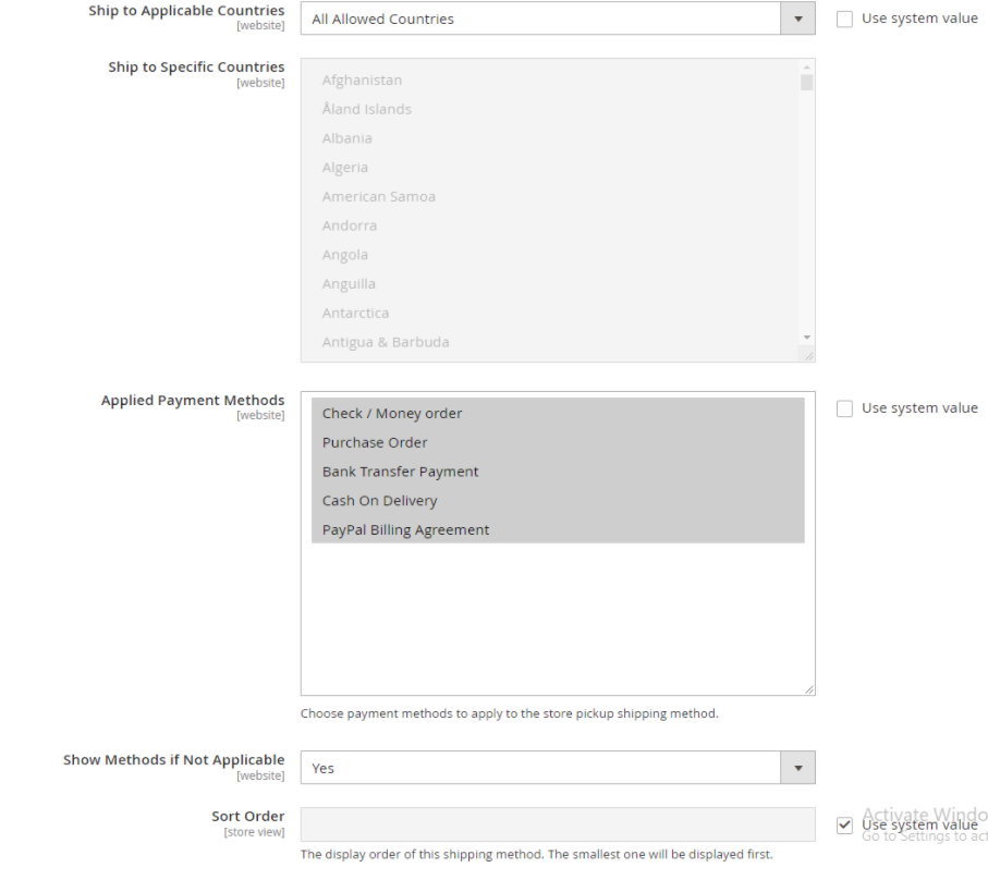 - All Allowed Countries: Apply the store pickup method to all countries.