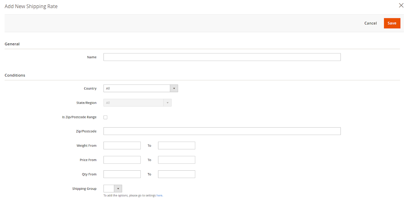 On the Shipping Rates tab, the admin can view the list of rates, add, edit or delete any rates. A rate of shipping method is determined by two main parts: condition for a cart to apply that rate and how to calculate shipping fee when the cart satisfies the condition.