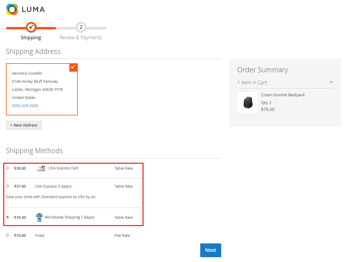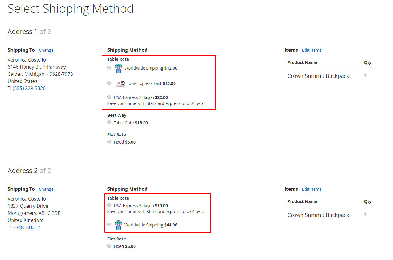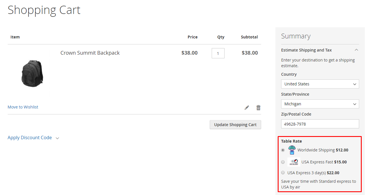 Mageplaza Magento 2 Table Rate Shipping, supports merchants to create an unlimited number of flexible shipping methods with their own shipping rates. Magento 2 admin can use a combination of conditions: destination, cart weight, subtotal cart, quantity cart and shipping group of products to calculate shipping accurately. These methods and rates are displayed flexibly at the frontend, making shopping and shipping options of customers more convenient, helping merchants to bring the best services to customers.