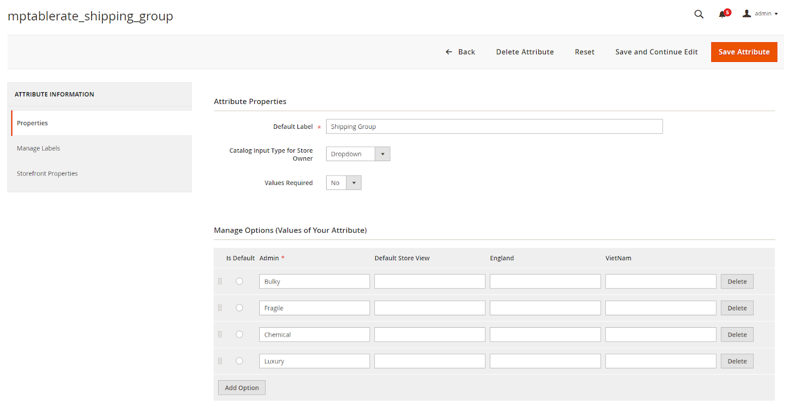 In Tab Properties> Manage Options (Values of Your Attribute), click the Add Option button to add a new option, you can set the label for the option according to the corresponding store view. Click Delete if you want to delete an option. Then click Save Attribute to save the changes.