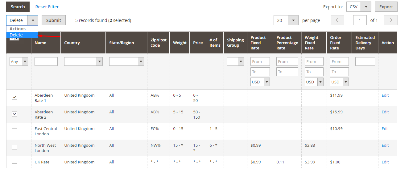 To delete one or more rates, you go to the Shipping Rates tab, in the grid Rate, select the rate you want to delete, click Massaction Delete, the Submit button will display. You just need to click Submit to delete the selected rate.