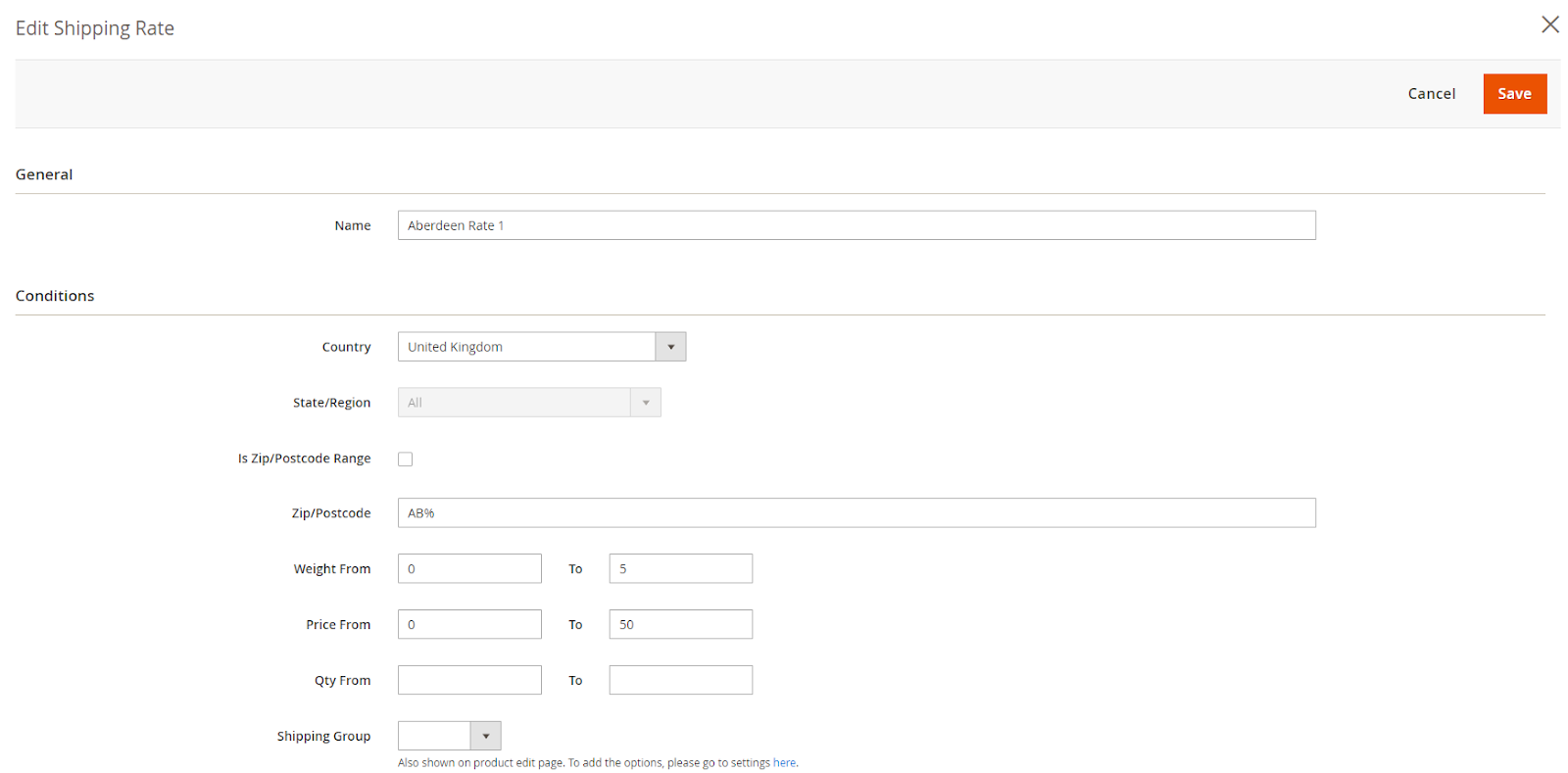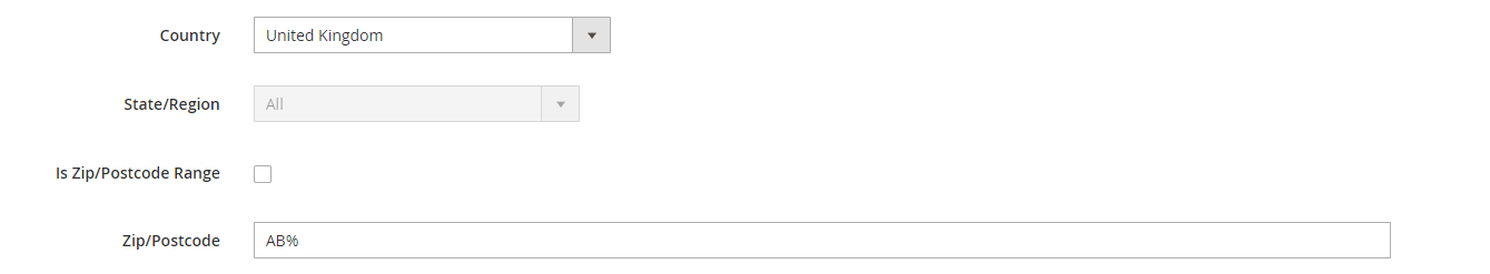 - Shipping location is Aberdeen in the UK with Postcode code starting with AB, you need to set Country = United Kingdom, uncheck the Zip/ Postcode Range checkbox and enter the value of the Zip/ Postcode = AB%.