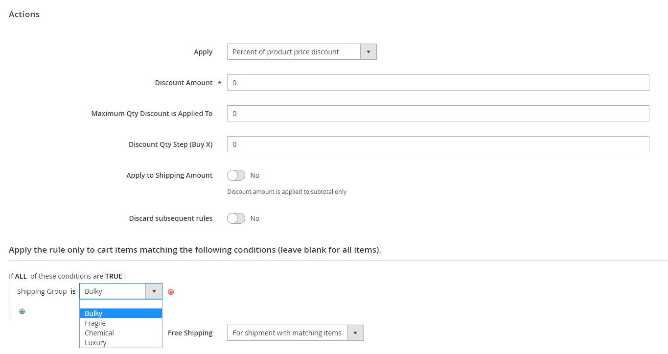 - Select the value of For matching items only to apply free shipping only for products of the selected shipping group.