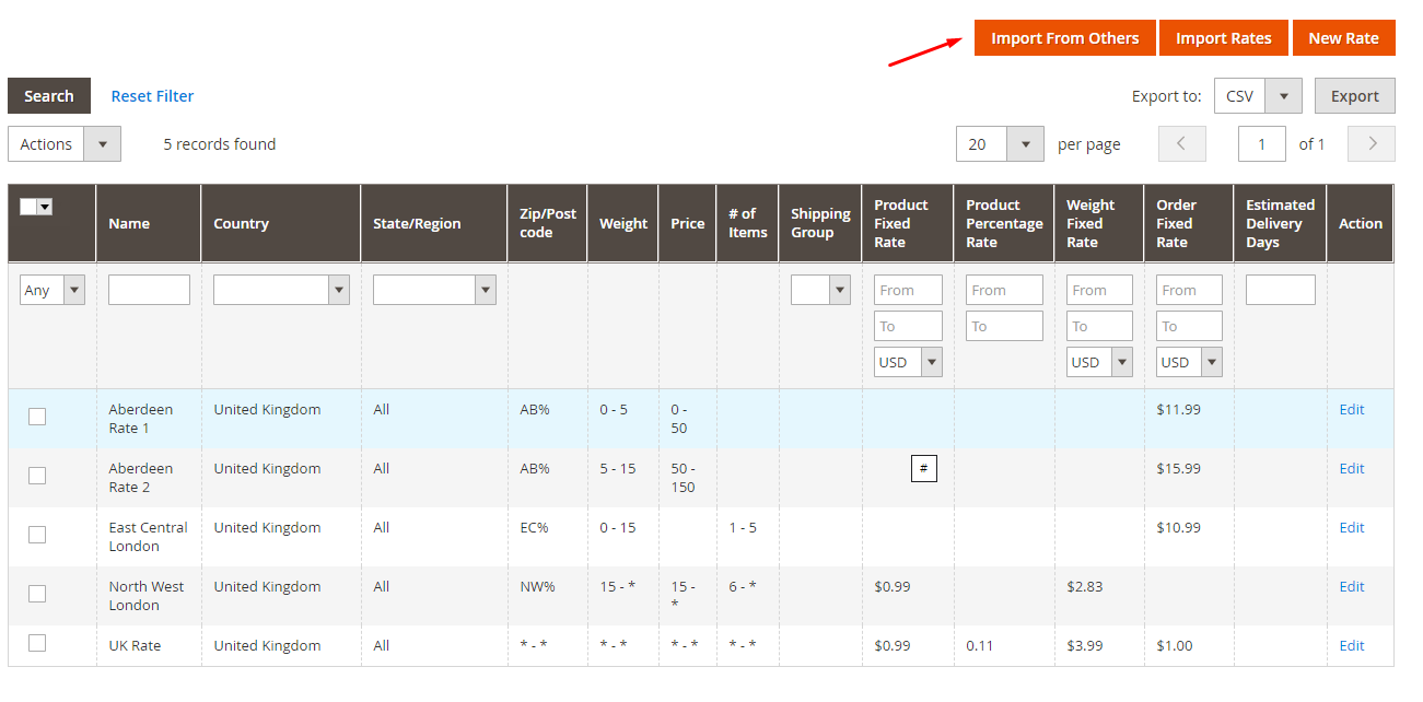 The extension supports allowing adding the existing rates of one shipping method to another. Just click Import From Others, the Select Shipping Rates popup will display, allowing you to select the desired shipping rates. Then you just need to click Import, the newly selected shipping rates will be added to the shipping method you are creating or editing.