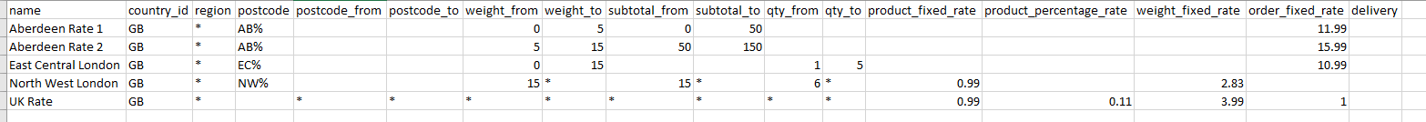 You can use csv file to import multiple rates at the same time. You just need to click the Import Rates button above the Rate management grid, the Import Shipping Rates popup will be shown. Please Choose File with csv format and its content matches the columns format as shown below and click Import (Note: the postcode field corresponding to the case of unchecking Zip / Postcode Range):