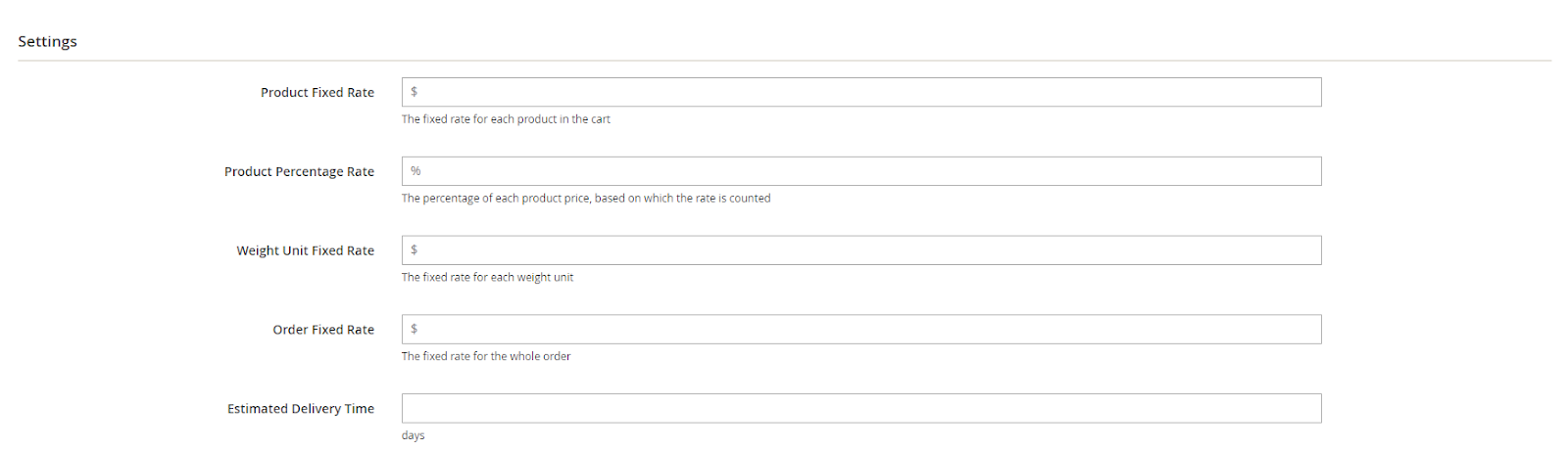 - **Order Fixed Rate**: The fixed rate for the whole orderShip fee will be equal to the sum of the rates corresponding to the cart combined. If you do not want to apply any rate for shipping, just leave that field blank. Leaving all fields blank is equivalent to the freeship for the cart. Also in the Settings tab, you can set the estimated shipping date in the Estimated Delivery Time field, this value will be displayed in the frontend to notify customers by variable