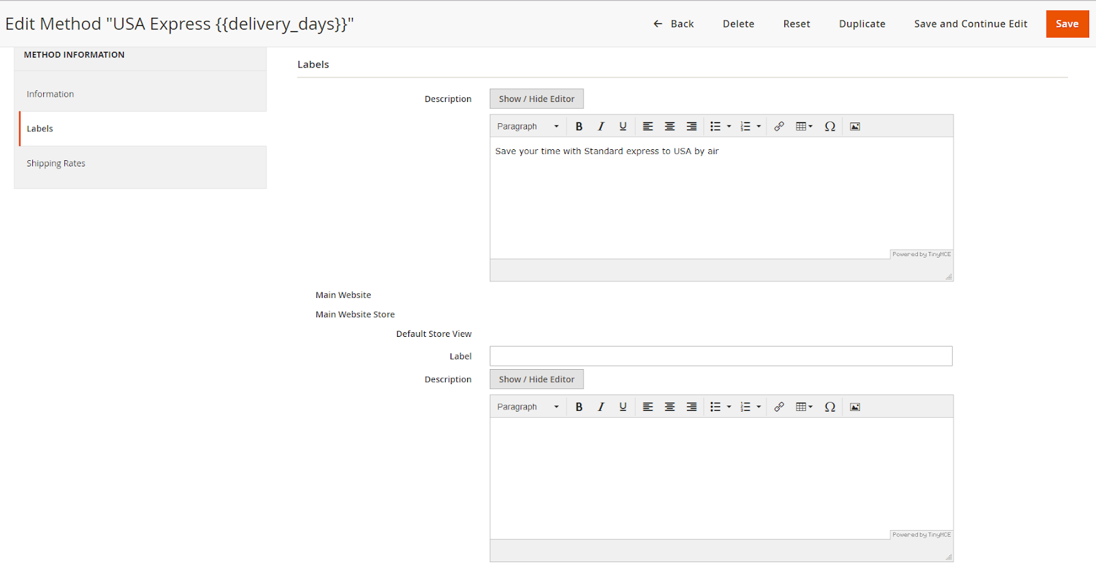 On the Label tab, the admin can set the display of the shipping method Label and shipping method Description according to each store view. If the Label and Description fields are left blank, the shipping method name will be the name on the default Information and Description tab.