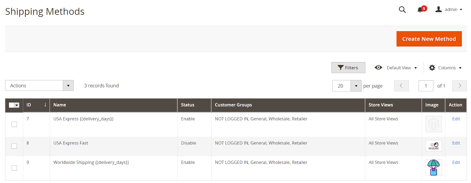 From the Grid, you can create a new shipping method by clicking the Create New Method button or editing the existing shipping method details by clicking to corresponding "Edit" action.
