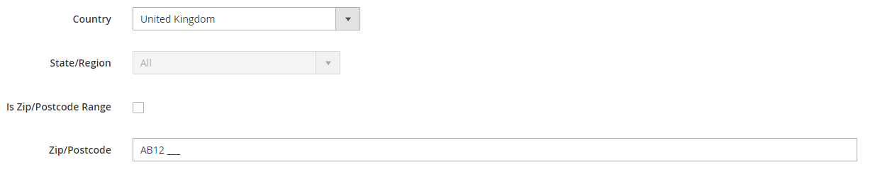 - Shipping location is Aberdeen in the UK with Postcode code starting with AB12, you need to set Country = United Kingdom, uncheck the Zip/ Postcode Range checkbox and enter the value of the Zip/ Postcode = AB12 ___, which is equivalent to all postcodes with 7 characters, starting with AB12, ending with any 3-character cluster, 2 characters are separated by a space " " will satisfy.