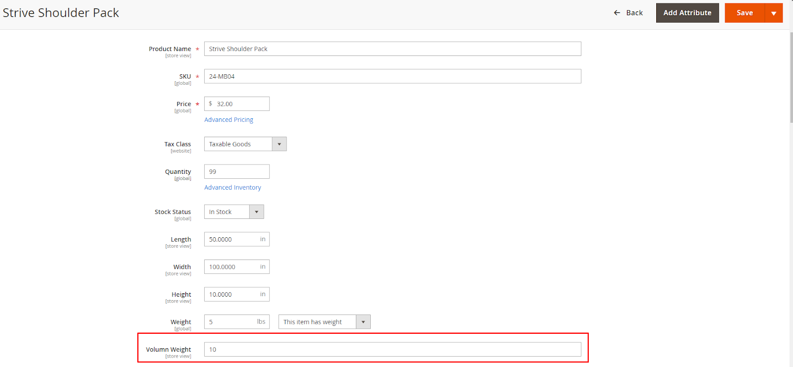 Volumetric: Indirectly determine the volume weight value through the product' s volume value. Selecting this option will display two additional fields: Select Volumetric (V) Attribute and Shipping Factor.