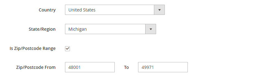 - Shipping location is Michigan in the US with Zipcode from 48001 to 49971, you need to set Country = United States, select the Zip / Postcode Range checkbox and enter the Zip / Postcode From = 48001 and To = 49971